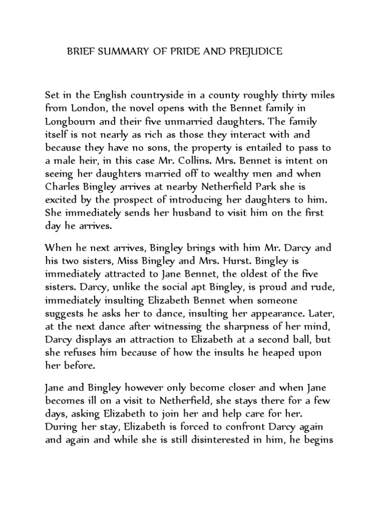 Web Summary Elizabeth rereads the letter trying to make sense of all she has learned. Web Pride and Prejudice Summary Pride and Prejudice is set primarily in the county of Hertfordshire about 50 miles outside of London. In this chapter Austen introduces the entail an old British custom designed to keep a family estate within the bloodline.